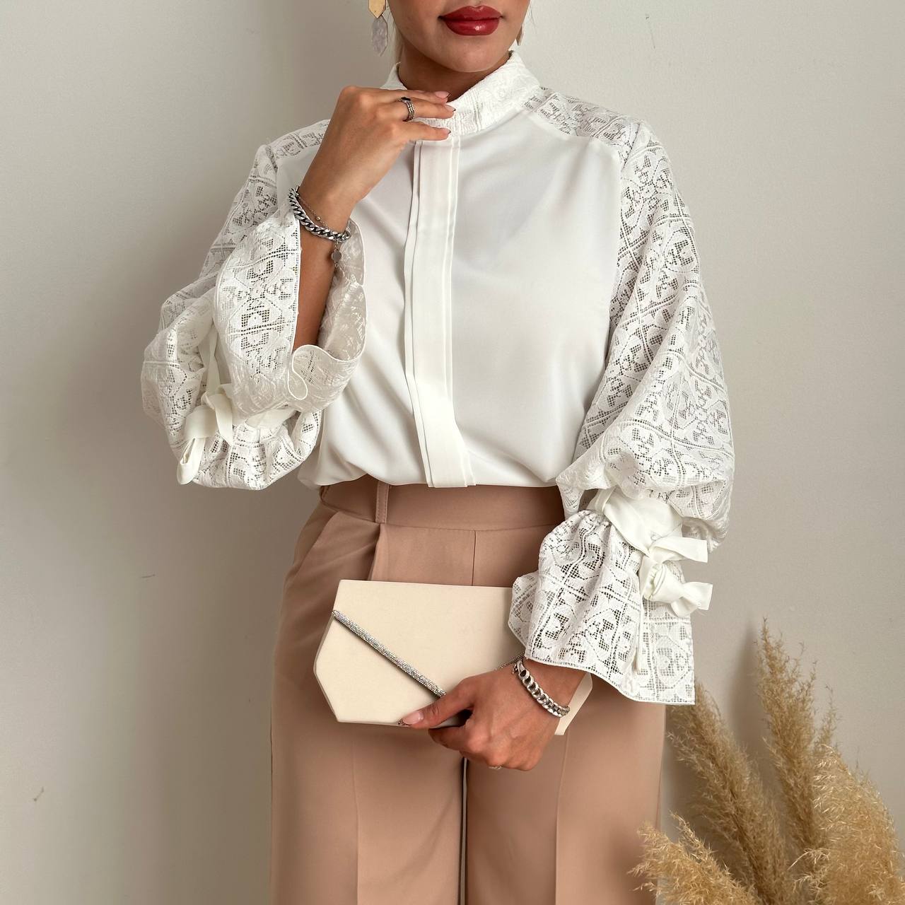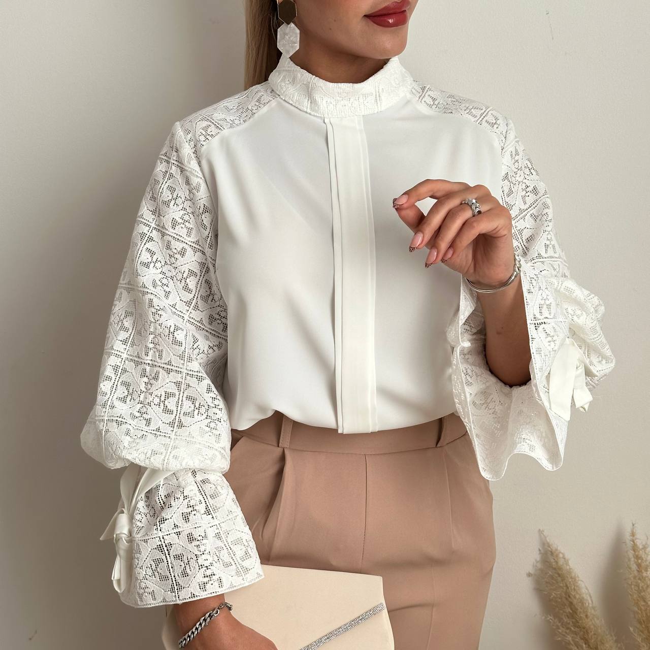 شومیز کرپ گیپور دوزی آستین عروسکی سفید